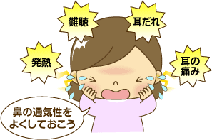ただし、鼻水が出続けていたりすると、痛くない滲出性中耳炎に知らないうちになって難聴がひどくなっていたり、急性中耳炎を繰り返す原因になるので注意が必要です。