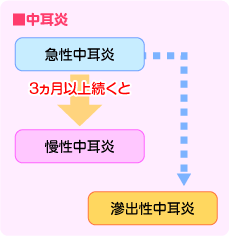 急性中耳炎や滲出性中耳炎が治りきらないと、耳の奥の薄い膜(鼓膜)に穴が状態が続くことがあります。この鼓膜に穴があいた状態が慢性中耳炎で、耳だれや難聴がおこります。